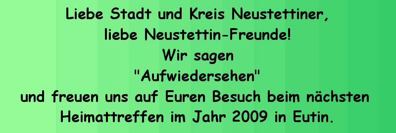 Eins muss man den Neustettinern ja lassen: Sie sind treu! Ihr Heimatkreisausschuss (HKA) hatte nämlich in den letzten drei Jahren viel Präsenz von ihnen erwartet. Vor zwei Jahren das Heimattreffen in Eutin, dann das Pommerntreffen in Travemünde im Mai 2006 und im September des gleichen Jahres das große Treffen anlässlich der 50jährigen Patenschaft der Stadt Eutin und des Kreises Ostholstein zur Stadt und zum Kreis Neustettin und nun das Heimattreffen, zu dem wieder 180 Landsleute angereist waren. Es waren zwar etwas weniger Teilnehmer als im Vorjahr, was aber wegen des schlechten Wetters verständlich war.