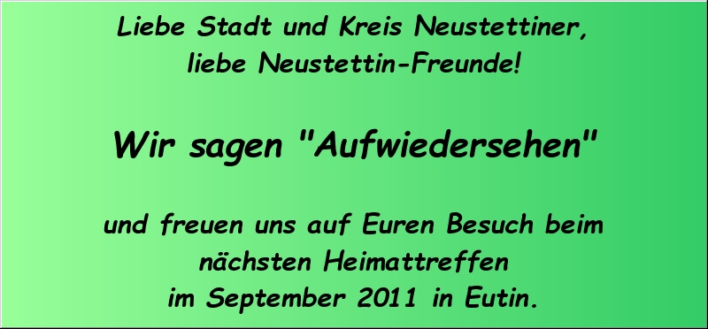 Das Nächste und für uns alte Neustettiner wohl letzte wichtige Großereignis wird die 700-Jahrfeier von Neustettin/Szczecinek sein. Unsere Stadt wird im nächsten Jahr 635 Jahre, die deutsche Stadt Neustettin (oder mit altem Namen für die Stadt) und 65 Jahre die polnische Stadt Szczecinek gewesen sein; darin sind wir uns mit den heutigen Bewohnern einig.